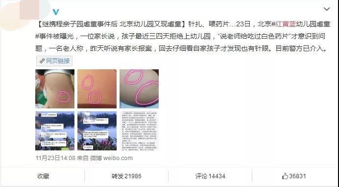 據有關消息,北京朝陽區紅黃藍幼兒園被曝出群體猥褻幼兒,出現給孩子喂不明白色藥片,喝褐色糖漿、脫光衣服體罰等虐待兒童行為。