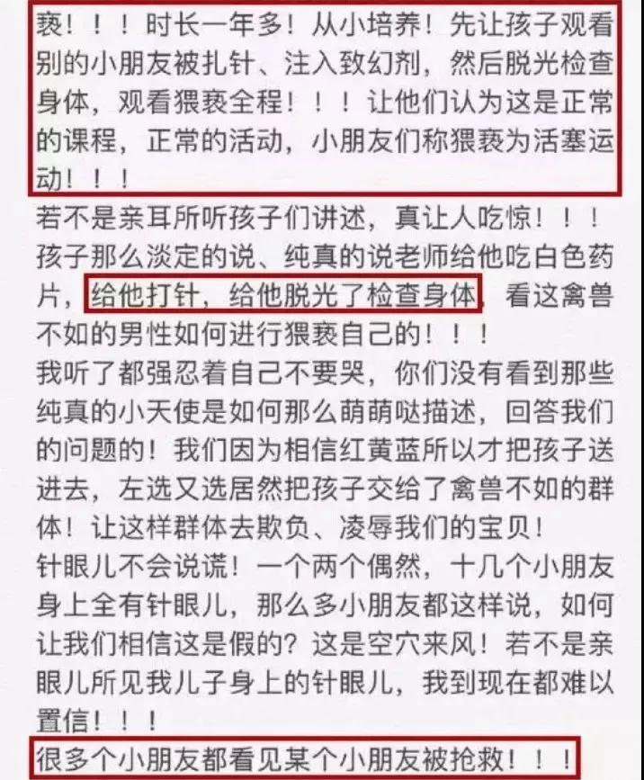 從上述的圖片中,我們可以整理出來,這并不是一場個別教師心理扭曲的變態虐童行為,而是一場有組織、有規模、有目的群體虐童行為!