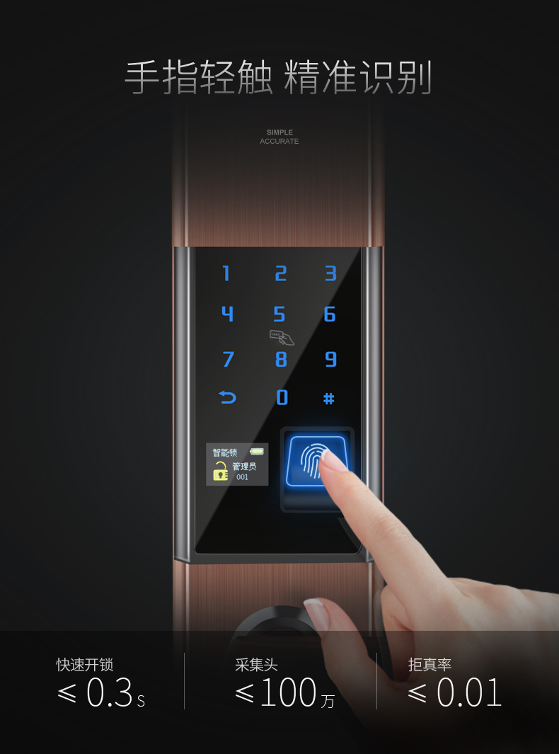 雖然如此,如果比較起來的話,指紋鎖還是比密碼鎖好用。因為指紋鎖只需要指紋在指紋鎖頭上按一下就好了,而密碼鎖則需要輸入一連串的數(shù)字才行,從開鎖的效率上要低一些。而且密碼鎖是需要記住密碼的,一家人使用,倘若是一個新的密碼,開始用的時候會比較費事。但如果是輸入指紋的話,一家人是沒有這么大的使用門檻的。密碼鎖還有一個問題就是,密碼如果被人看了去,就容易打開家門。當(dāng)然在安全性上,以前的指紋鎖也不一定就比密碼鎖高多少,因為以前的指紋鎖大多采用光學(xué)指紋頭,所以容易被復(fù)制的指紋打開。但指紋與密碼的開鎖方式,往往是出現(xiàn)在同一款鎖上的,這樣用起來也可以避免單用一種打不開的情況——下圖的玻璃門智能鎖就是這樣,此外還帶了半導(dǎo)體指紋頭和虛位密碼設(shè)計,安全性有了提高。