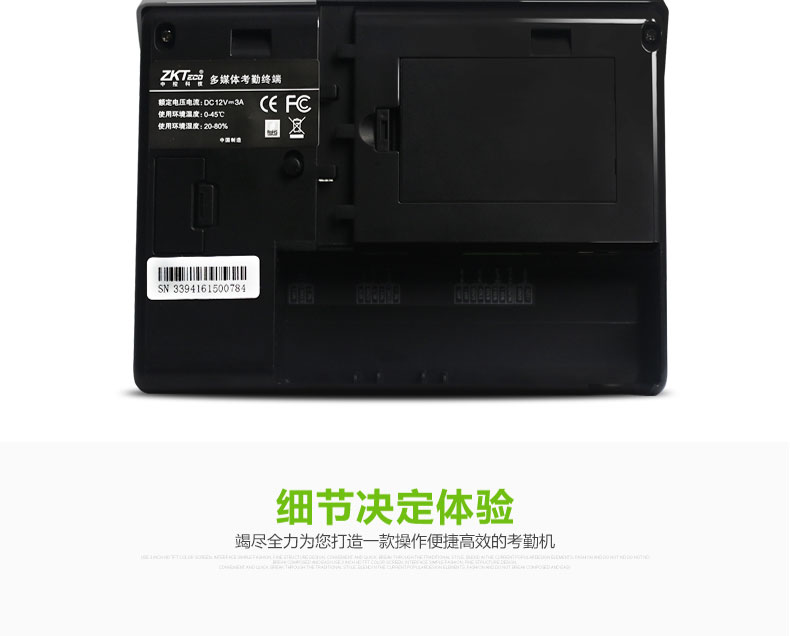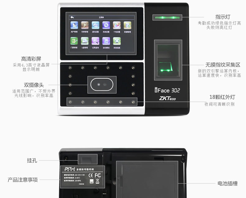 該產品采用了中控科技最新的ZEM600核心板,ZKFinger10.0指紋面部混合識別算法,容量大,識別速度快,集成高分辨率夜視紅外和彩色雙攝像頭功能,適用范圍廣,不受外界光線的影響,無論是在強光下還是在黑暗中也能進行有效識別。該系列已經通過了超過10萬面部數據庫長達2年的測試,同時該算法也在美國San Jose大學年度測試中名列前矛,在用戶舒適度方面獲得了最佳評分。iFace采用了嵌入式中控Multi-Bio CPU,主頻為630MHZ,可以處理高達1:20000的1:N速度,符合人體工程學的外觀設計,工業設計由德國專業公司主導完成,模具采用了PC材料+蝕紋工藝+鏡面工藝,采集比對就如照鏡子一般,支持4.3寸全觸摸TFT,僅有6個狀態功能鍵,其它按鍵在TFT上全觸摸操作。標配TCP/IP通訊方式,支持跨網段跨網關連接。