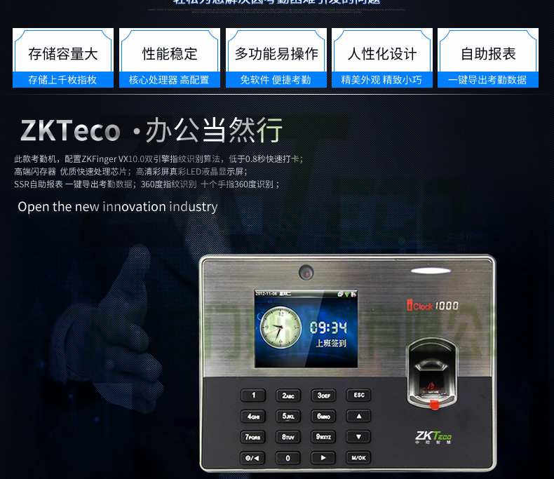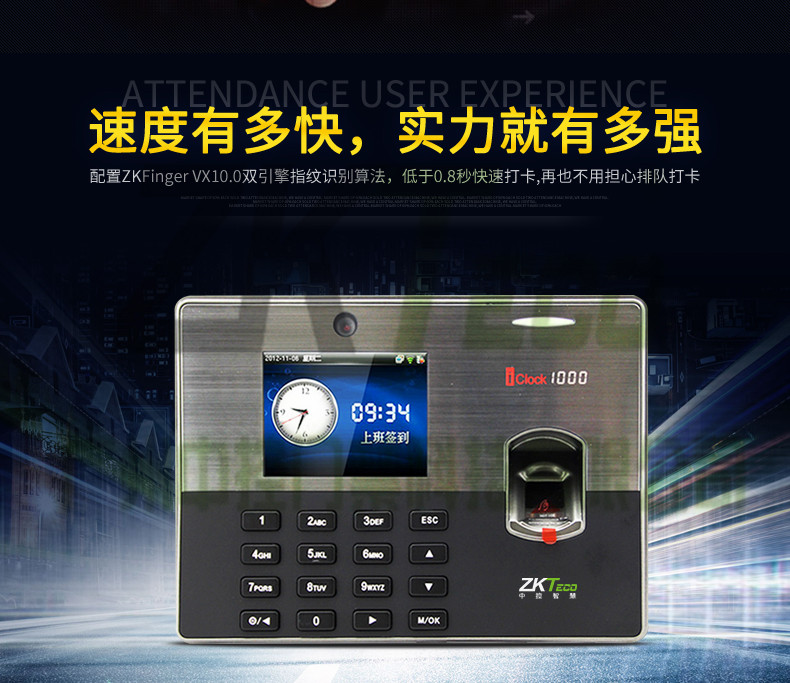 iclock1000是中控科技推出的一款3.5寸彩屏指紋考勤機,該款產(chǎn)品在原來3.5寸彩屏考勤產(chǎn)品的基礎上增加了攝像頭拍照功能,內(nèi)置130萬像素高淸攝像頭,可以輕松實現(xiàn)員工照片拍攝和顯示,標準的TCPP通訊,經(jīng)過∪SB「協(xié)會認證的U盤下載和cien模式通訊,方便得T9輸入法,對公對私的短消息功能、用戶可自走義的走時響鈴和其高貴典雅的外觀設計,可選配MF、GPRS無線通訊,適合100-500人考勤管理。